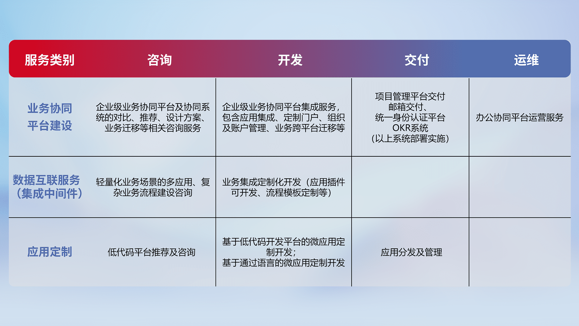 针对钉钉、、、、企微、、、、IDaas等平台级产品提供产品的规划、、、方案、、、、交付、、、、定制化开发等服务,,实现如统一协同办公、、、、智能客户服务、、混合会议管理、、、、智能数据查询、、、等业务场景,,,实现数字化转型。。
